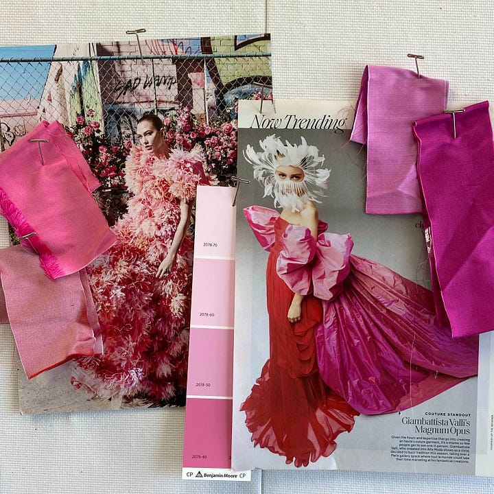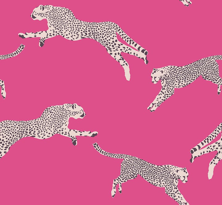 As a textile designer, I discovered the power of pink with a pattern I created for heritage brand, Scalamandré, called Leaping Cheetah. The design features a pair of cheetah silhouettes on a contrasting ground color, and first launched as a printed wallcovering in 2020. When I was developing the palette, I remember feeling like the bubblegum colorway was a risk. Was it the right pink? Too kitsch? Not serious enough for our audience of traditional interior designers? Beiges and blues were expected bestsellers, but with this pattern, bubblegum far exceeded my expectations. Long before the release of the Barbie movie, I learned firsthand that there is a market for pink.